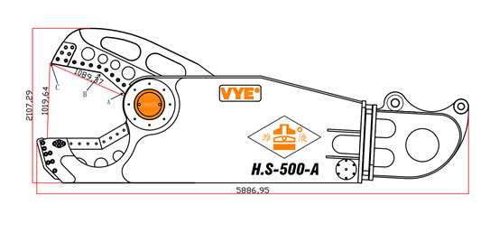 濰液® VYE®H.S-500挖掘機(jī)液壓剪,鷹嘴剪,分大臂型和小臂型。適合安裝于40噸-55噸各品牌挖掘機(jī)大臂使用,以及50噸以上各品牌挖機(jī)小臂使用。剪頭自重約6280 kg,總長度約5888mm,高度約2100mm。剪刃部最大開口約1020 mm,喉口深度約1080 mm。 剪切力368噸,剪切能力強(qiáng)大。